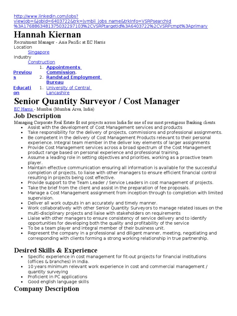 Http Jamiesoncontracting Co Uk Staging Wp Content Uploads 2015 01 Senior Quantity Surveyor Transport Infrastructure Job Description Pdf